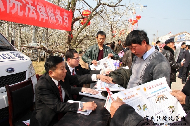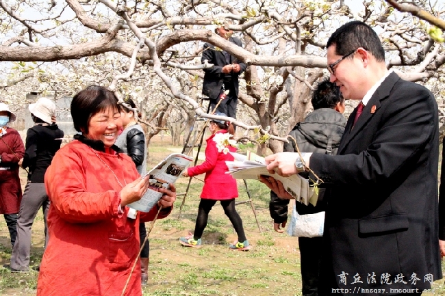 4月3日,宁陵县举办第十二届梨花节,宁陵县人民法院以花为平台,在“梨花节”期间开展送法律服务到梨园活动,法律服务点和宣传车分布在梨园各处,为梨农和游客送去法律大餐。据悉,仅4月3日当天,该院就发放宣传册600余份,接待咨询100余人次。