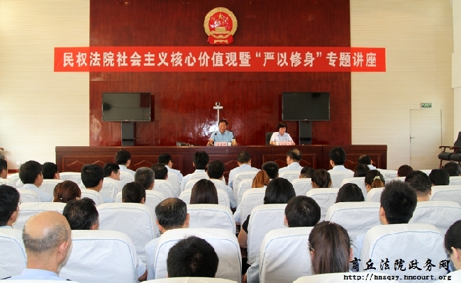 为大力弘扬社会主义核心价值观,认真践行“三严三实”要求,7月21日下午,民权县人民法院邀请中国庄子和谐道德促进会会长、郑州大学客座教授常孝坤,为全院干警开展社会主义核心价值观暨“严以修身”专题讲座。讲座由党组成员、副院长扈琳主持。