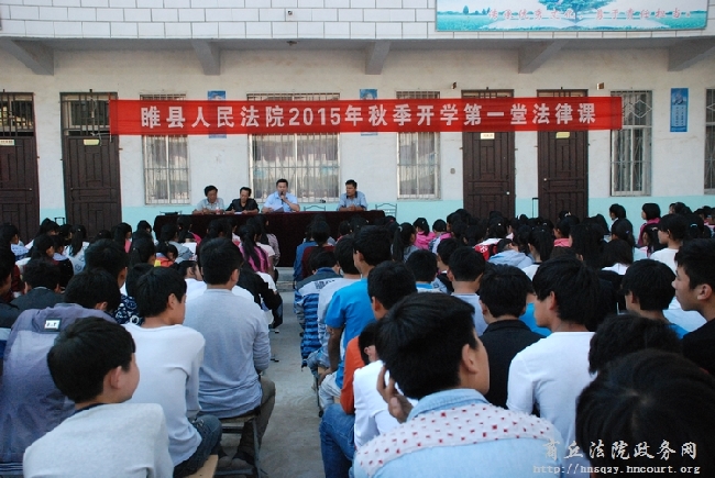 为进一步提高辖区中小学生的法治意识,增强其依法维权能力,自8月30日起,睢县人民法院开展了2015年秋季新学期开学第一堂法律课活动,组织全院30名骨干法官,深入辖区各中心学校,采取上法律课、举办法律知识专题讲座、制作法制宣传展板、开展法律知识问卷调查、指导学生开模拟法庭、邀请青少年学生旁听案件审理、到中小学校播放法治宣传微电影等多种形式,为青少年健康成长营造良好的法治氛围和环境。截止9月16日,该院法官已上法律课18次,为18700多名青少年学生送去了“法治教育大餐”。