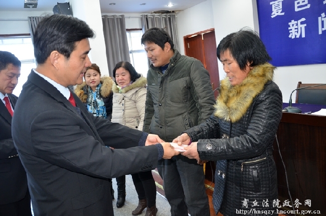 12月18日上午,夏邑县人民法院召开农民工工资案件执行款集中发放新闻发布会,该院党组书记、院长杨松挺当场为17名农民工发放12万余元执行款。