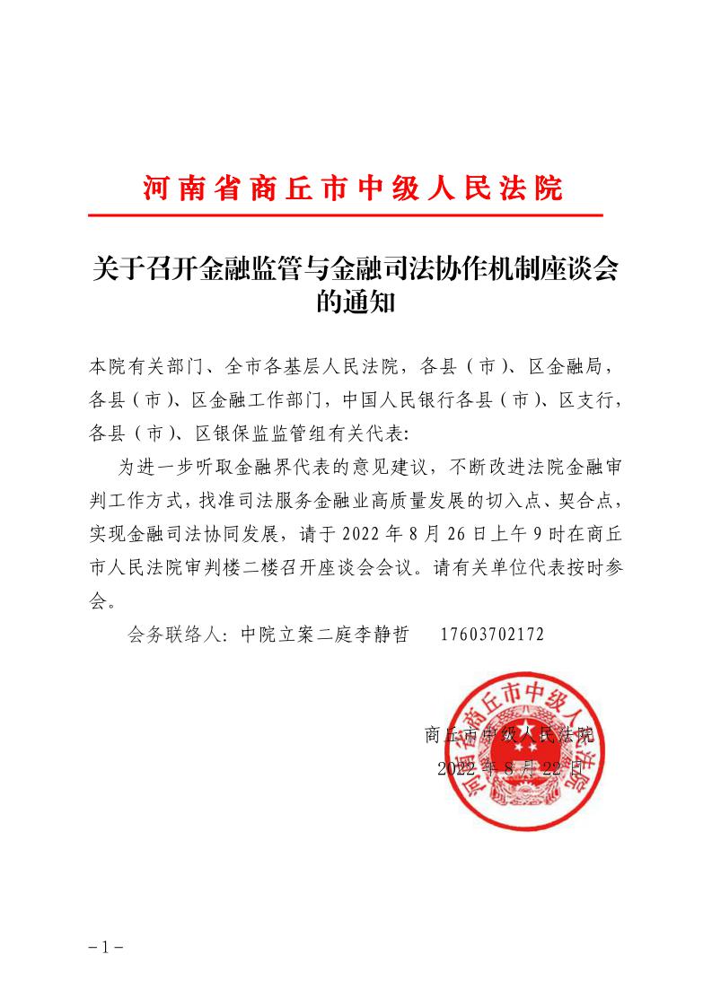 商丘市中级人民法院 关于召开金融监管与金融司法协作机制座谈会的通知
