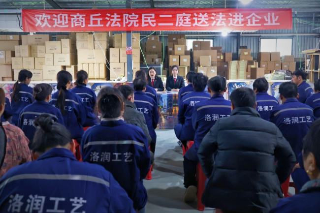 3月10日,女法官国际日当天,商丘中院组织女法官开展“送法进企业”普法宣传活动。中院民二庭副庭长韩慧莹一行走进商丘洛润工艺品有限公司,为公司30余名职工送上“法治礼包”,助力提升企业依法经营意识和职工法律素养。