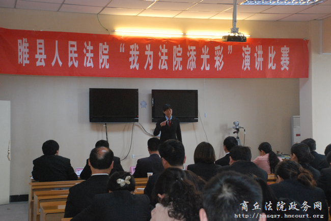 为扎实推进党的群众路线教育实践活动,增强广大干警的职业荣誉感,引导法官牢固树立司法为民、公正司法意识,4月29日下午,睢县法院举行了一场以“我为法院添光彩”为主题的演讲比赛。参赛的13名选手紧紧围绕主题,结合自身工作实际,以饱满的热情、质朴的语言、动人的事例和真挚的情感生动诠释了自己对法院事业的无限忠诚与深深挚爱,充分展示了法院青年干警奋发向上的青春活力与风采。他们举止自然、吐字清晰、积极向上、慷慨激昂的精彩演讲,不时赢得全场阵阵热烈掌声。