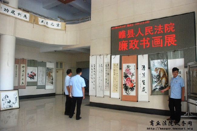 为办好本次廉政书画展,睢县法院专门成立了活动领导组和办公室,制定作品征集方案,号召全院干警、人民陪审员、廉政监督员和干警家属踊跃参与,利用业余时间积极创作,并将征集到的优秀作品装裱后悬挂在办公楼一楼大厅,供大家交流、学习。