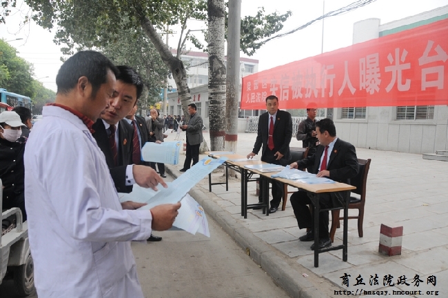 10月29日,商丘市梁园区人民法院通过印发“曝光老赖”宣传单、设立宣传台、现场公布“老赖”案情等措施,对涉及全市范围内的4家单位、107名个人拒不履行生效法律文书确定义务的被执行人,纳入第三批失信被执行人名单,并通过发放传单等形式,向全社会予以曝光。